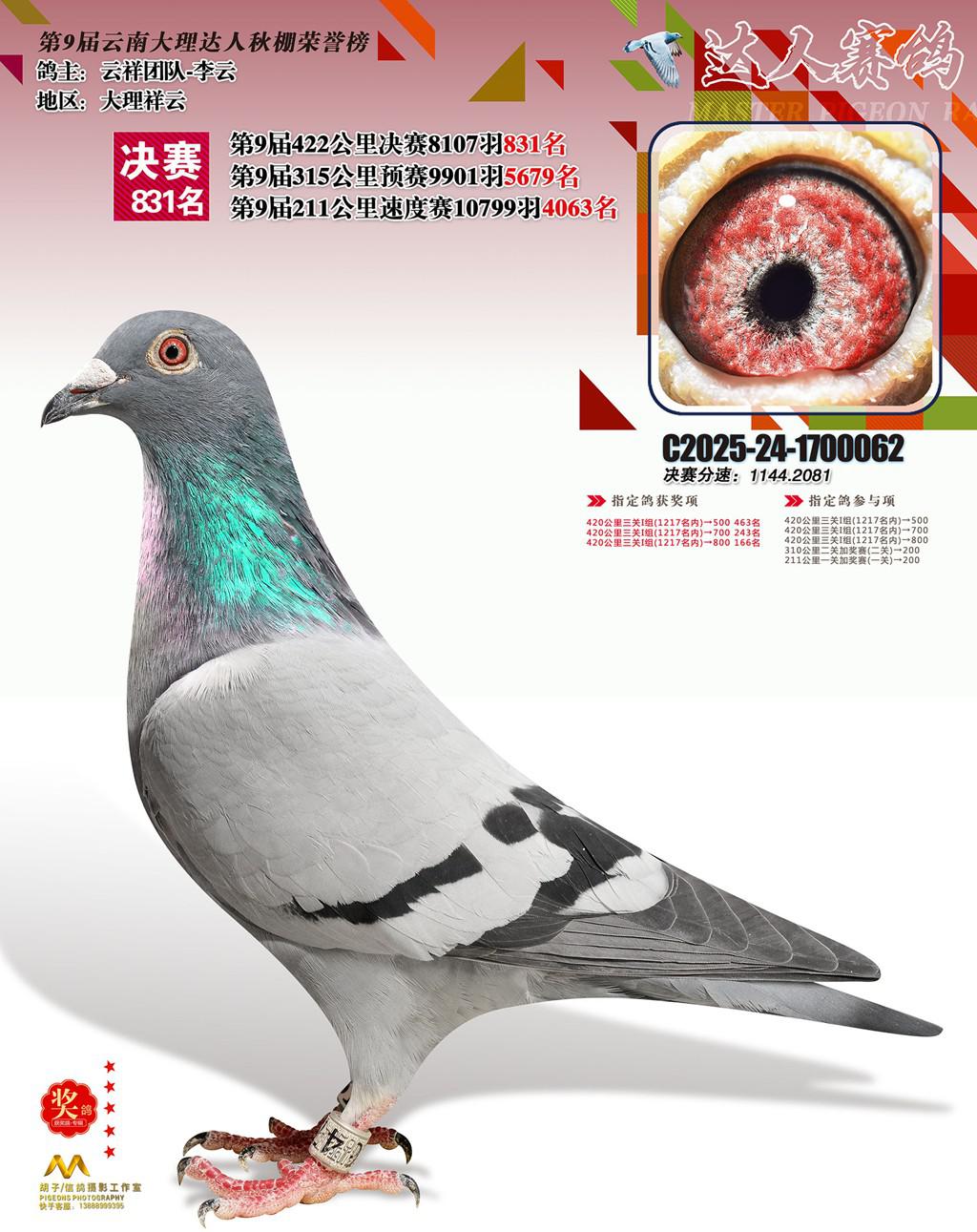 位置:云南大理巍山达人赛鸽中心2025获奖鸽展示\831名