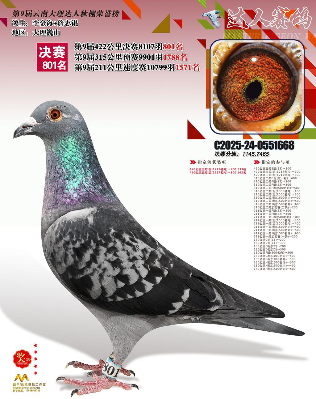位置:云南大理巍山达人赛鸽中心2025获奖鸽展示\801名