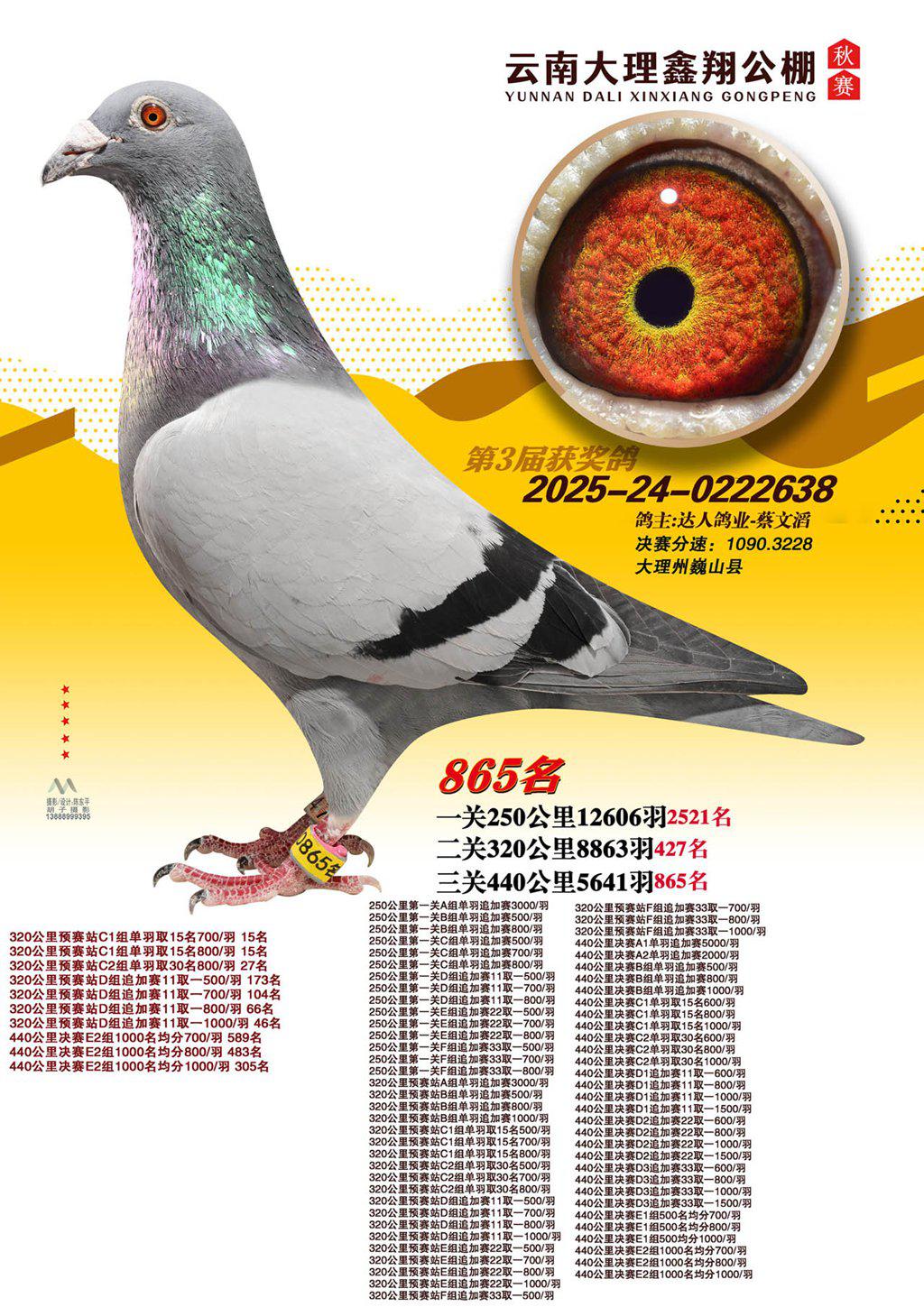 位置:云南大理鑫翔公棚2025获奖鸽展示\865名