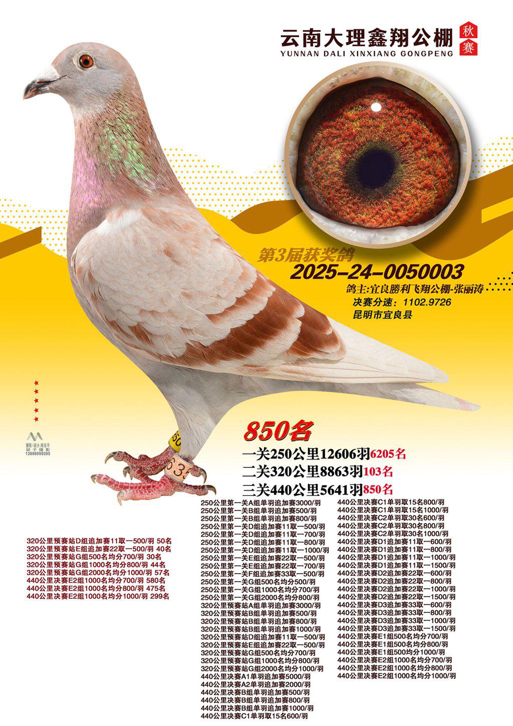 位置:云南大理鑫翔公棚2025获奖鸽展示\850名
