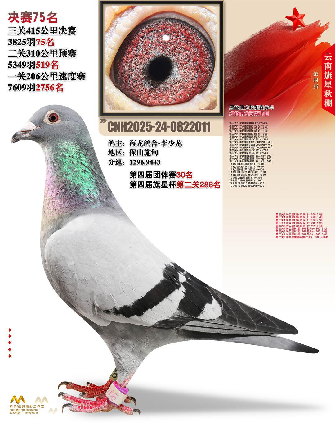 云南大理旗星赛鸽中心2025决赛75名海龙鸽舍-李少龙24-0822011保山施甸获奖鸽展示!