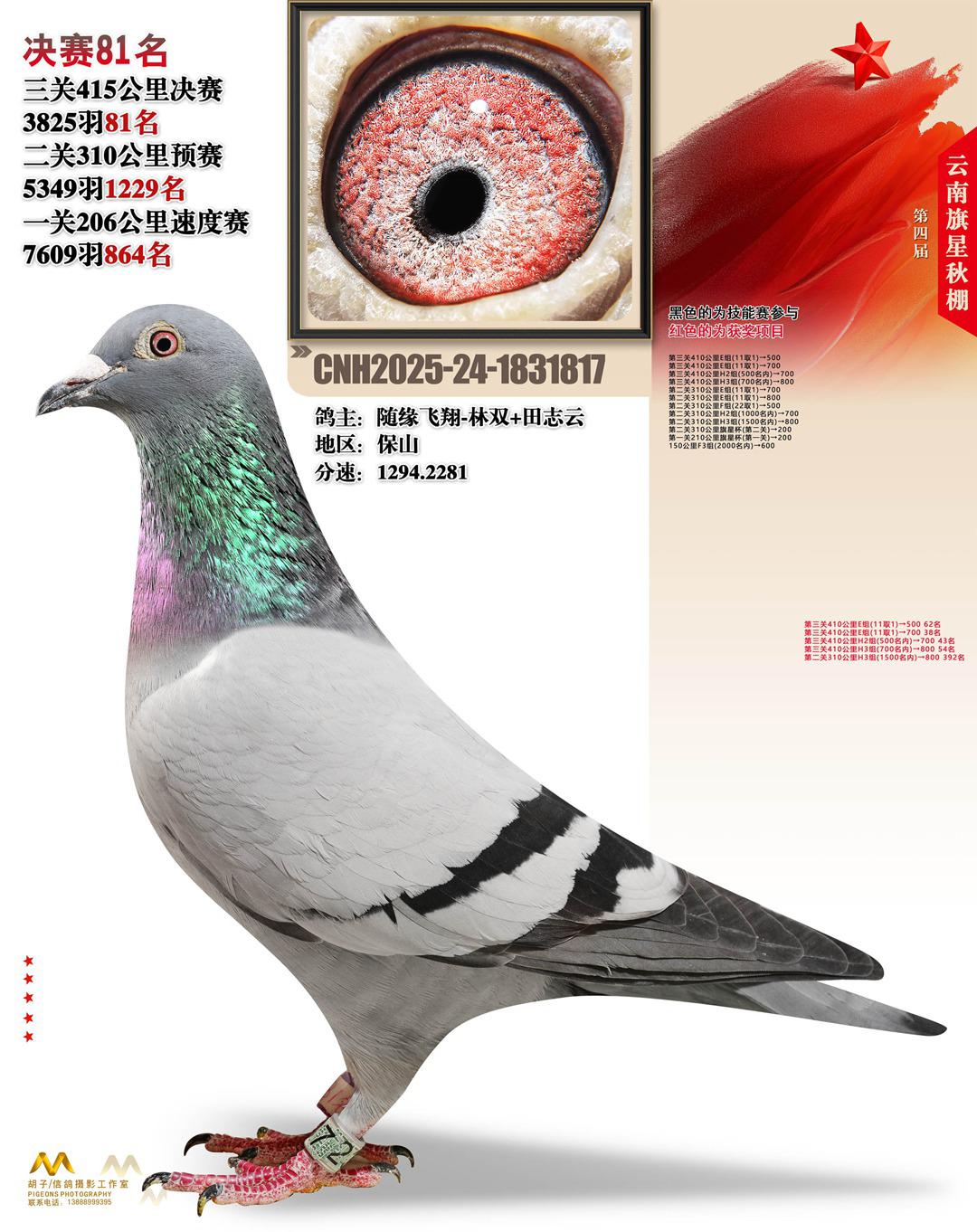 云南大理旗星赛鸽中心2025决赛81名随缘飞翔-林双+田志云24-1831817保山获奖鸽展示!
