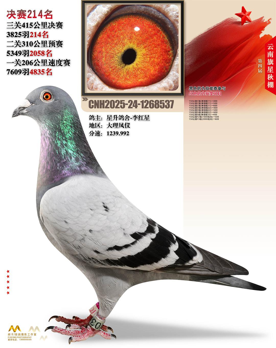 云南大理旗星赛鸽中心2025决赛214名星升鸽舍-李红星24-1268537大理凤仪获奖鸽展示!