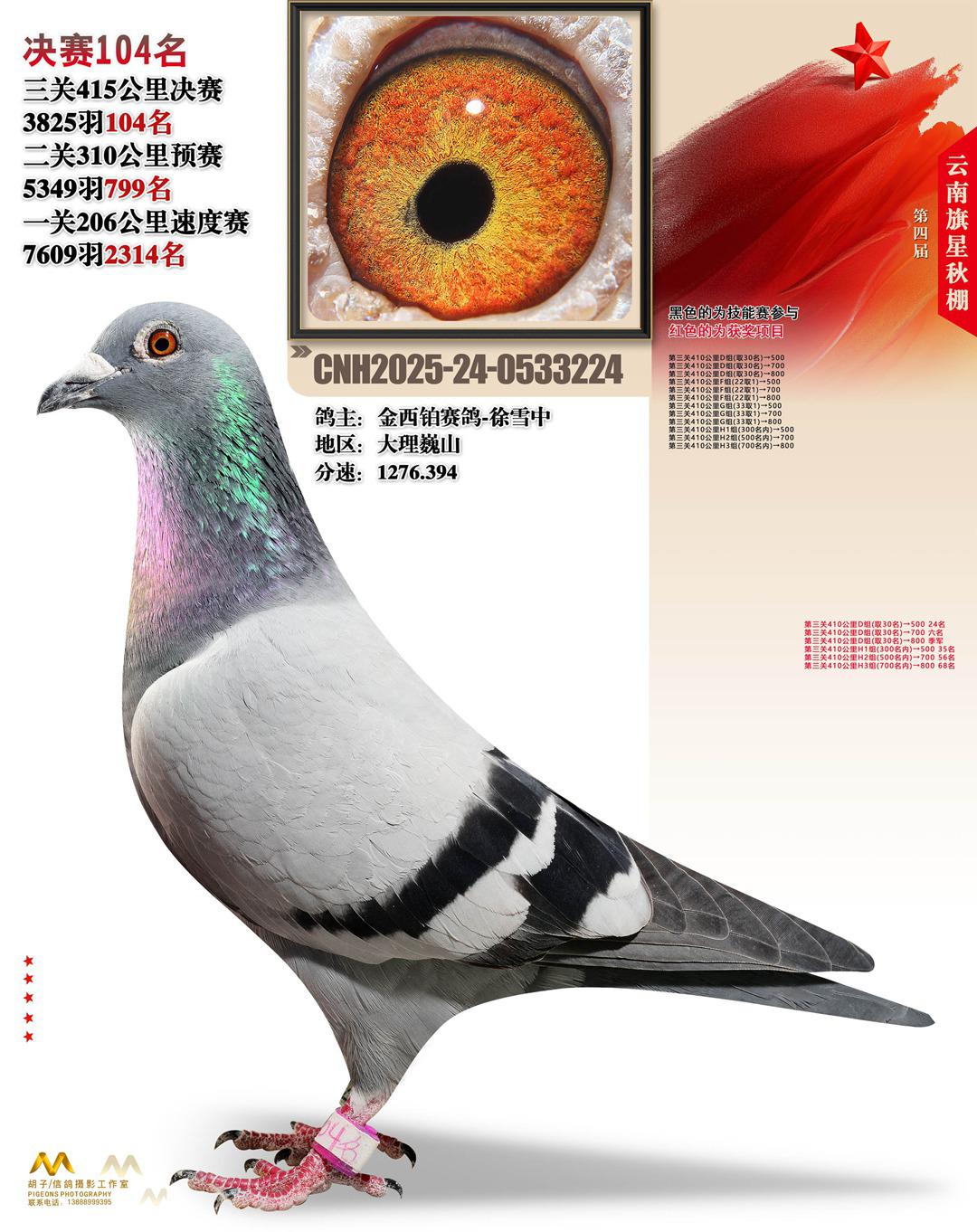 云南大理旗星赛鸽中心2025决赛104名金西铂赛鸽-徐雪中24-0533224大理巍山获奖鸽展示!