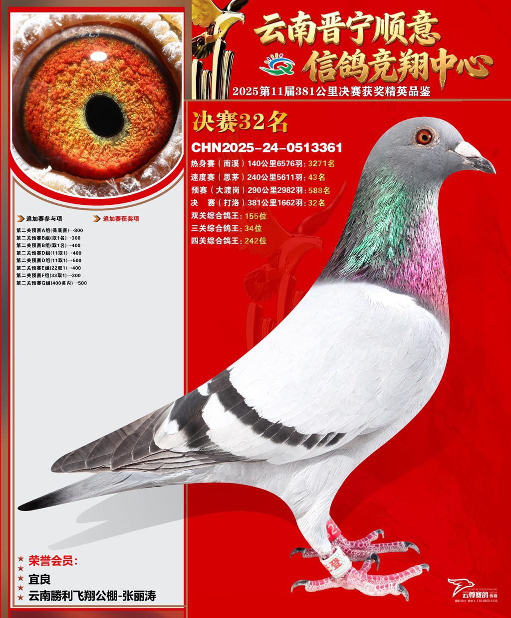 云南晋宁顺意信鸽竞翔中心2025决赛32名云南勝利飞翔公棚-张丽涛2025-24-0513361宜良获奖鸽展示!