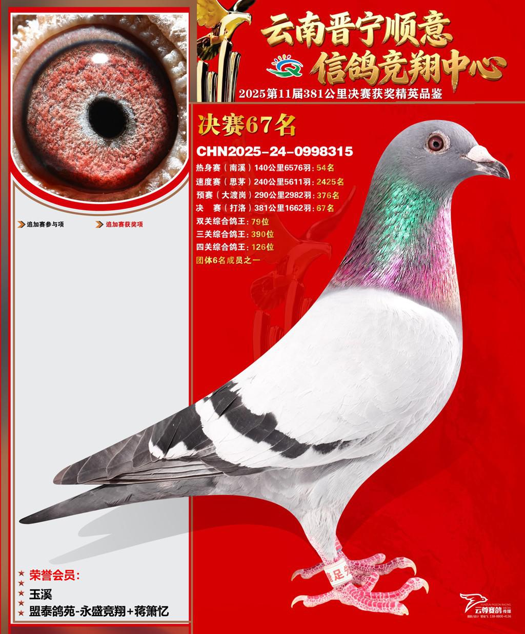 云南晋宁顺意信鸽竞翔中心2025决赛67名盟泰鸽苑-永盛竞翔+蒋箫忆2025-24-0998315玉溪获奖鸽展示!