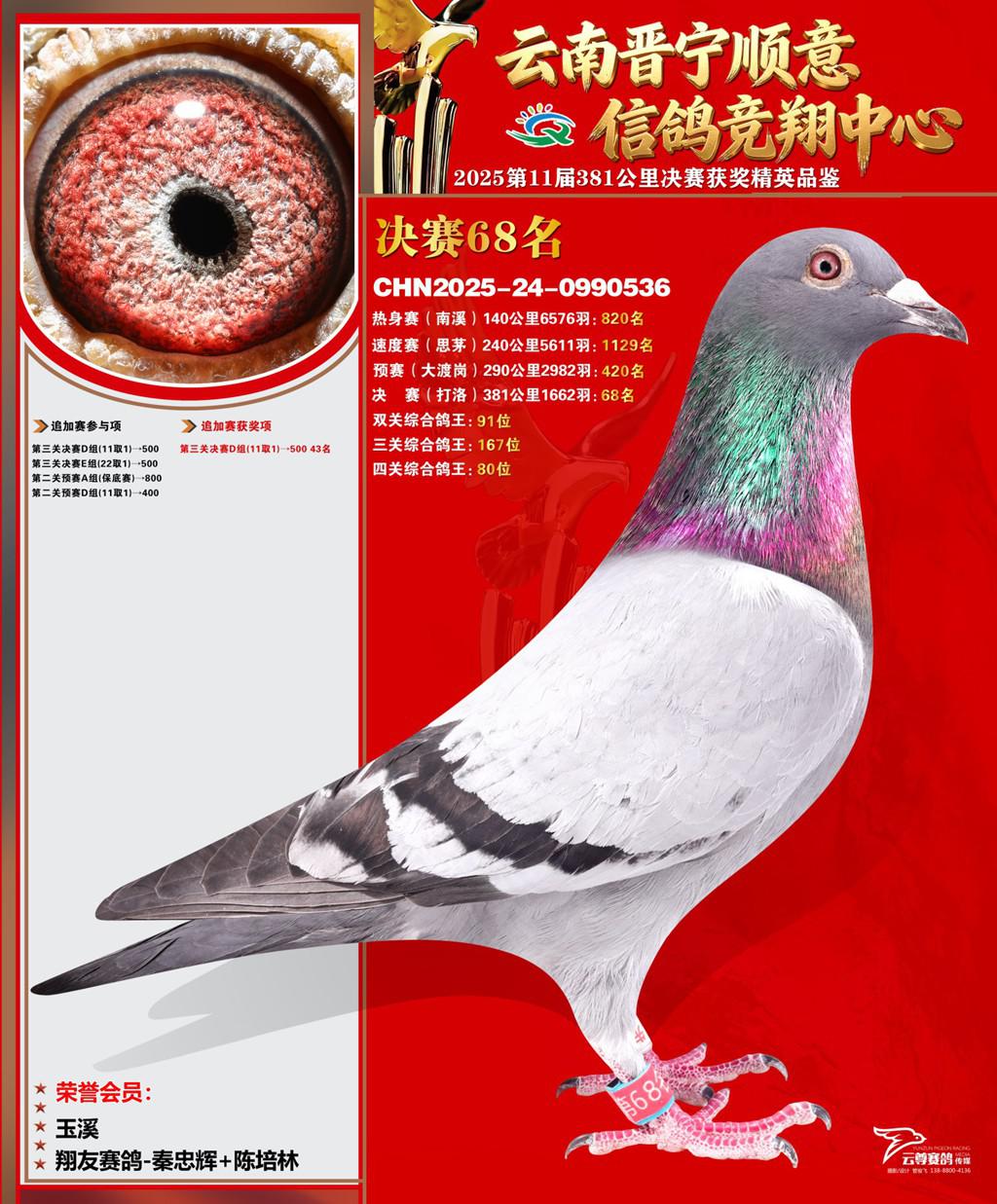 云南晋宁顺意信鸽竞翔中心2025决赛68名翔友赛鸽-秦忠辉+陈培林2025-24-0990536玉溪获奖鸽展示!