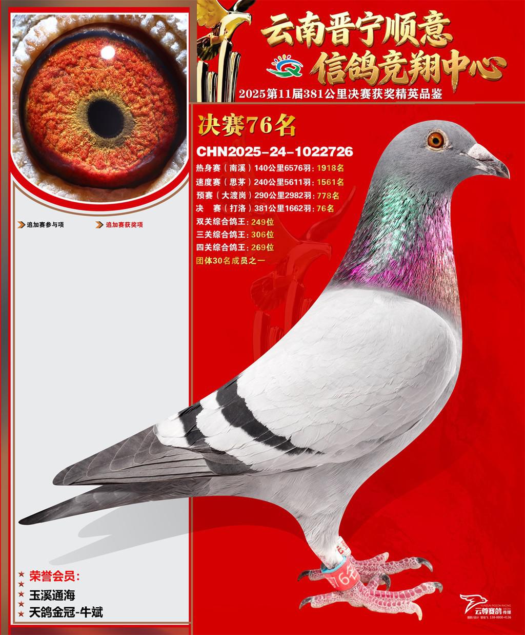 云南晋宁顺意信鸽竞翔中心2025决赛76名天鸽金冠-牛斌2025-24-1022726玉溪通海获奖鸽展示!