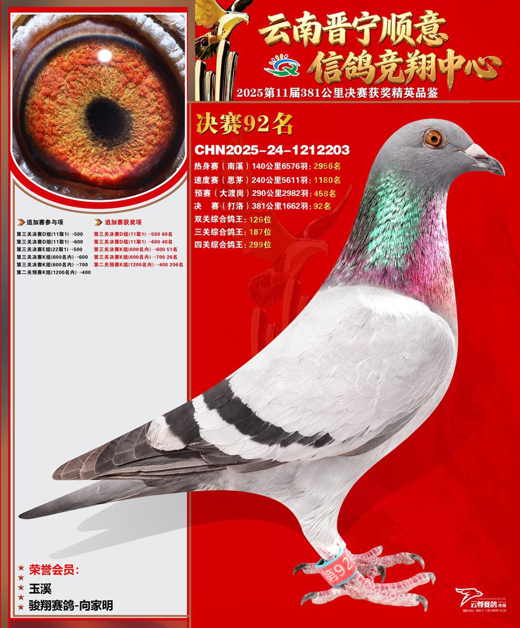 云南晋宁顺意信鸽竞翔中心2025决赛92名骏翔赛鸽-向家明2025-24-1212203玉溪获奖鸽展示!