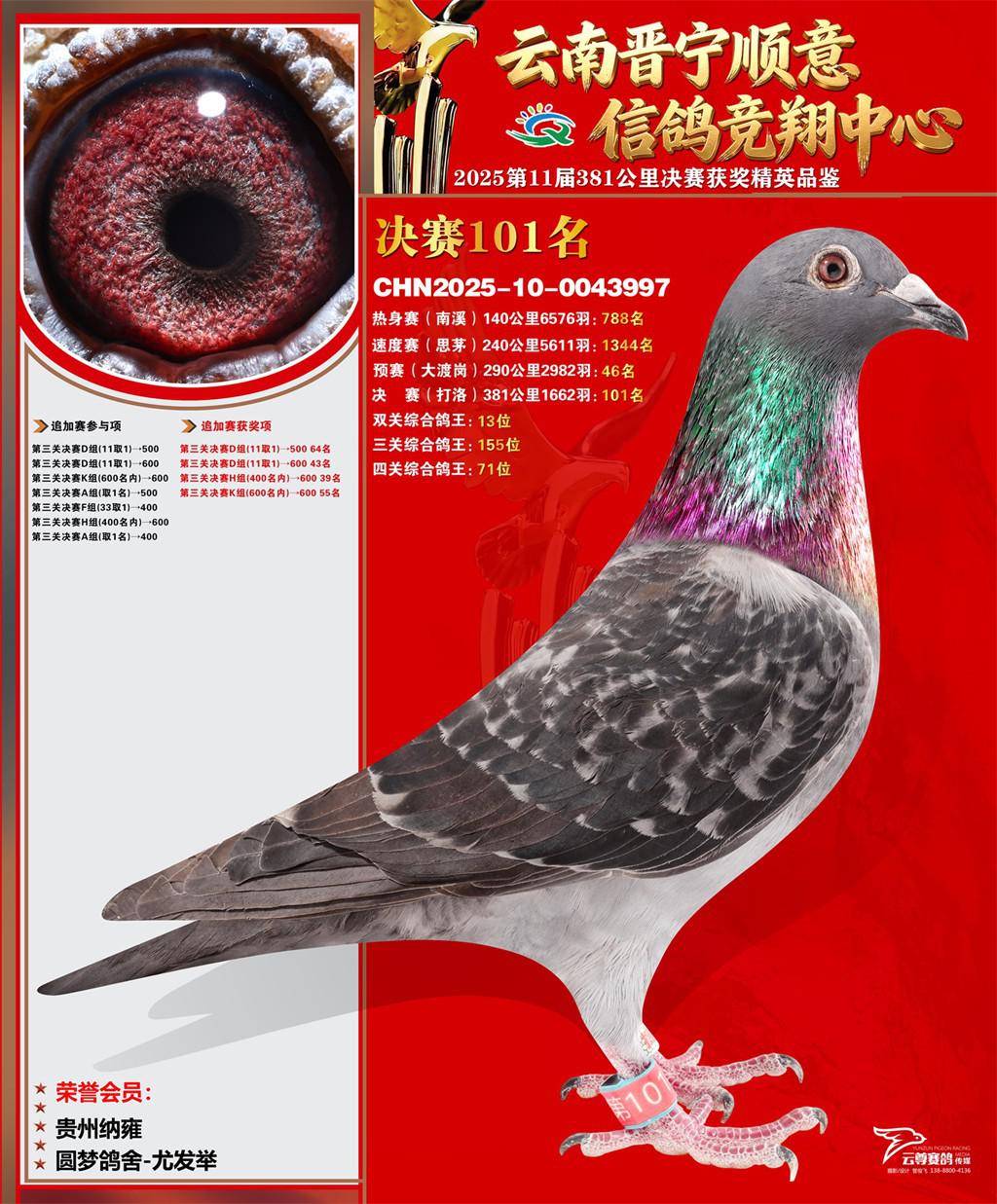 云南晋宁顺意信鸽竞翔中心2025决赛101名圆梦鸽舍-尤发举2025-10-0043997贵州纳雍获奖鸽展示!