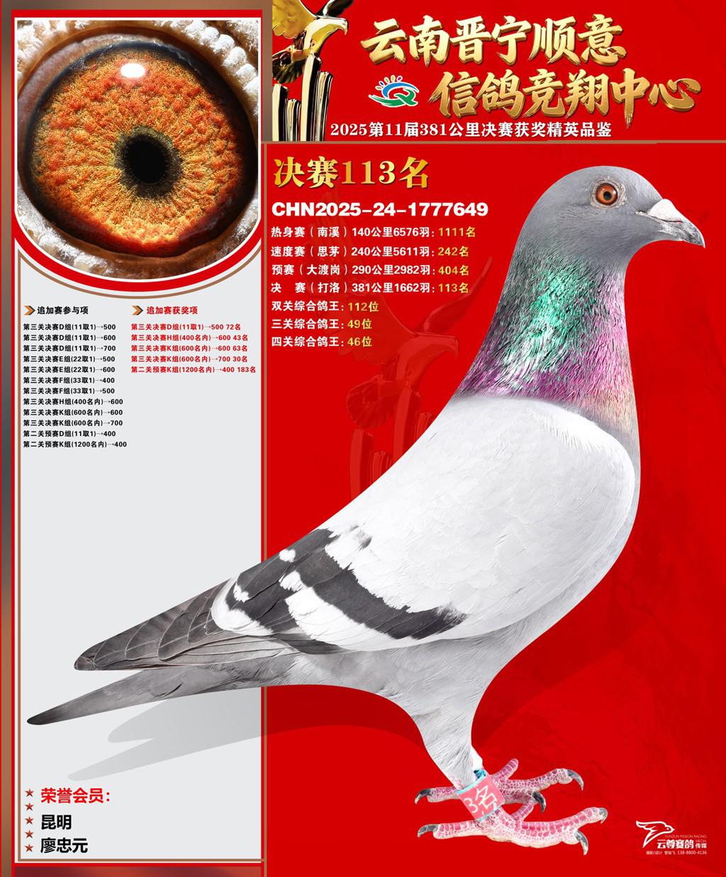 云南晋宁顺意信鸽竞翔中心2025决赛113名廖忠元2025-24-1777649昆明获奖鸽展示!