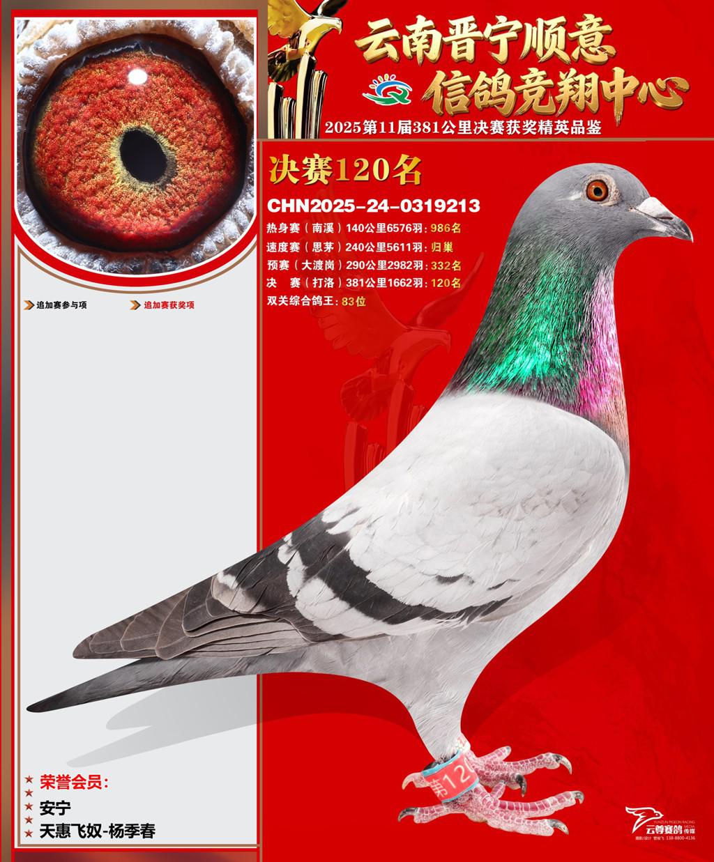 云南晋宁顺意信鸽竞翔中心2025决赛120名天惠飞奴-杨季春2025-24-0319213安宁获奖鸽展示!