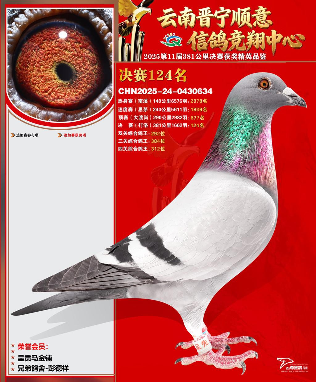 云南晋宁顺意信鸽竞翔中心2025决赛124名兄弟鸽舍-彭德祥2025-24-0430634呈贡马金铺获奖鸽展示!