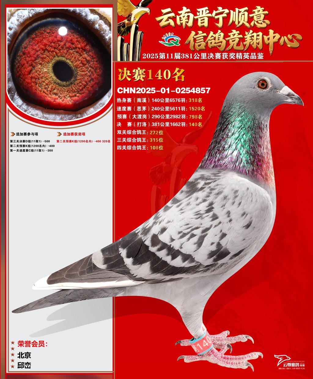 云南晋宁顺意信鸽竞翔中心2025决赛140名邱峦2025-01-0254857北京获奖鸽展示!