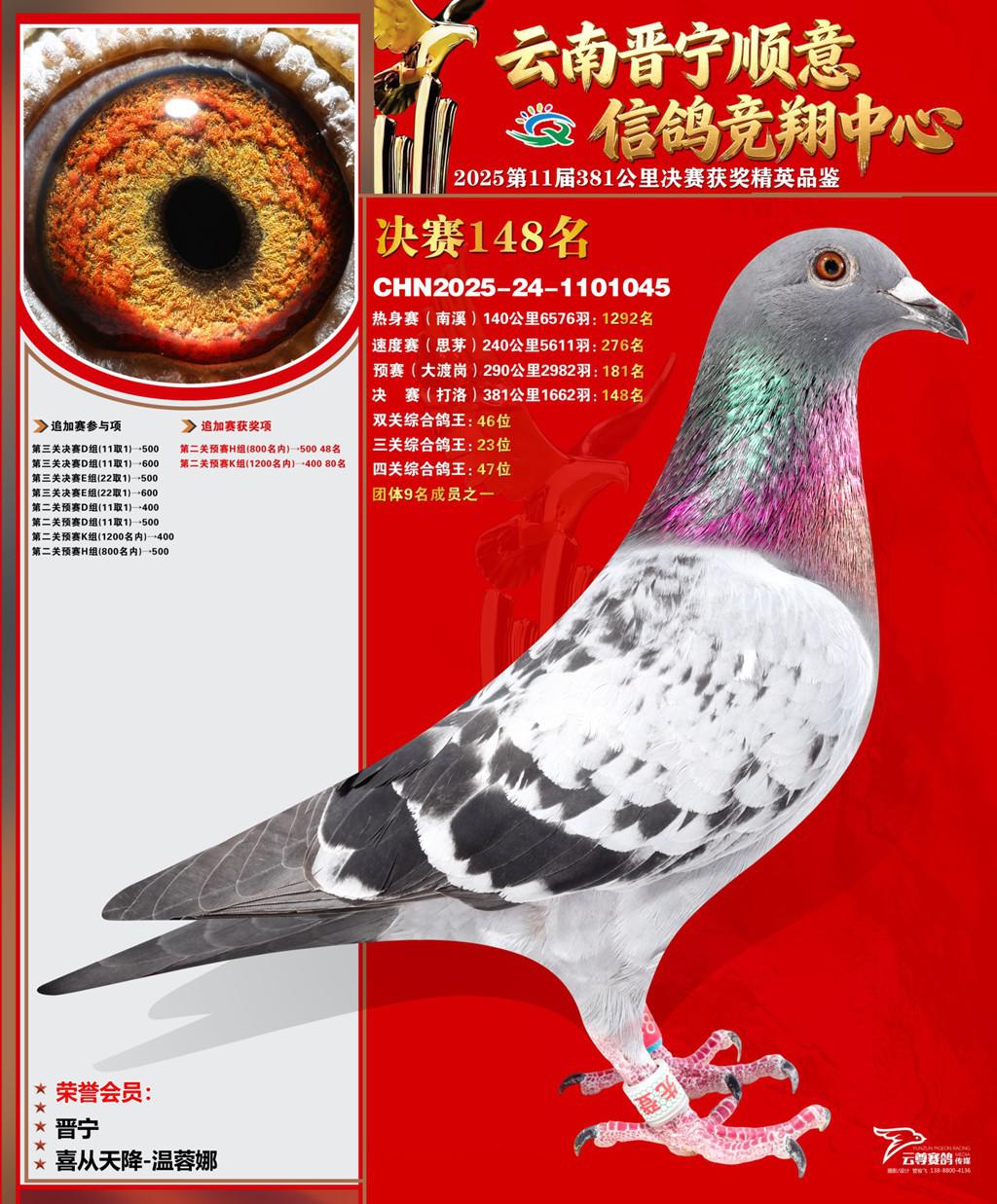云南晋宁顺意信鸽竞翔中心2025决赛148名喜从天降-温蓉娜2025-24-1101045晋宁获奖鸽展示!