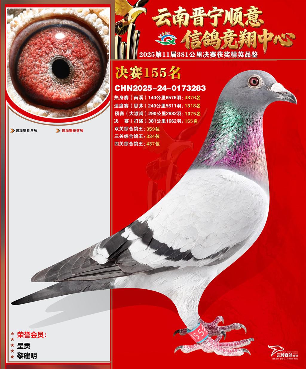 云南晋宁顺意信鸽竞翔中心2025决赛155名黎建明2025-24-0173283呈贡获奖鸽展示!