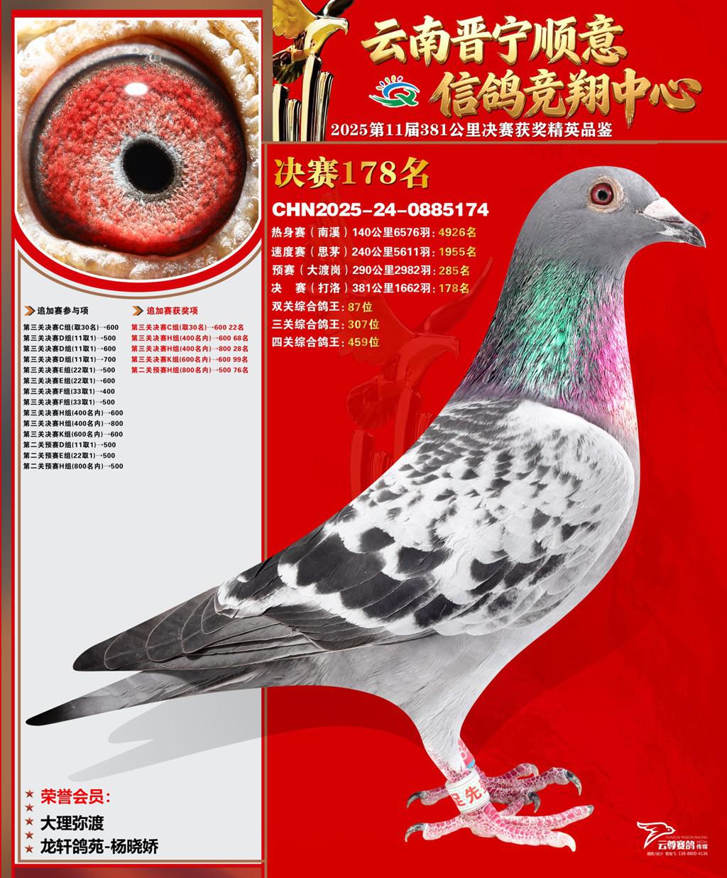 云南晋宁顺意信鸽竞翔中心2025决赛178名龙轩鸽苑-杨晓娇2025-24-0885174大理弥渡获奖鸽展示!
