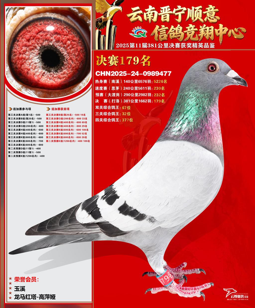 云南晋宁顺意信鸽竞翔中心2025决赛179名龙马红塔-高萍娅2025-24-0989477玉溪获奖鸽展示!