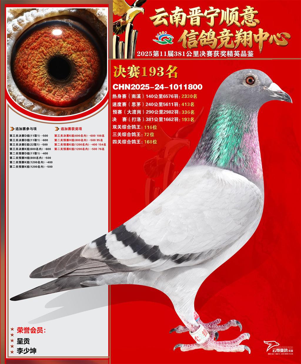 云南晋宁顺意信鸽竞翔中心2025决赛193名李少坤2025-24-1011800呈贡获奖鸽展示!
