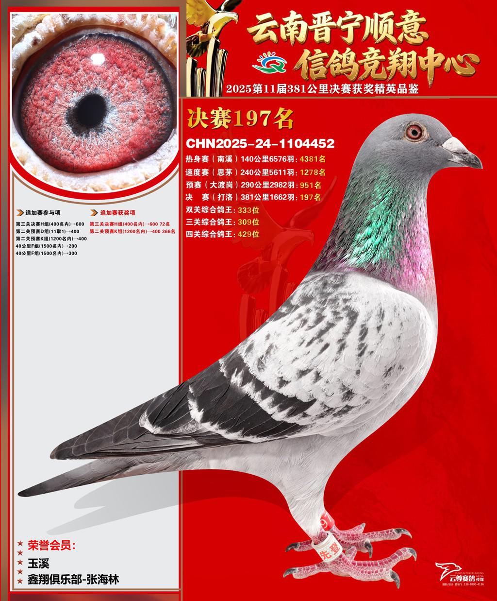 云南晋宁顺意信鸽竞翔中心2025决赛197名鑫翔俱乐部-张海林2025-24-1104452玉溪获奖鸽展示!