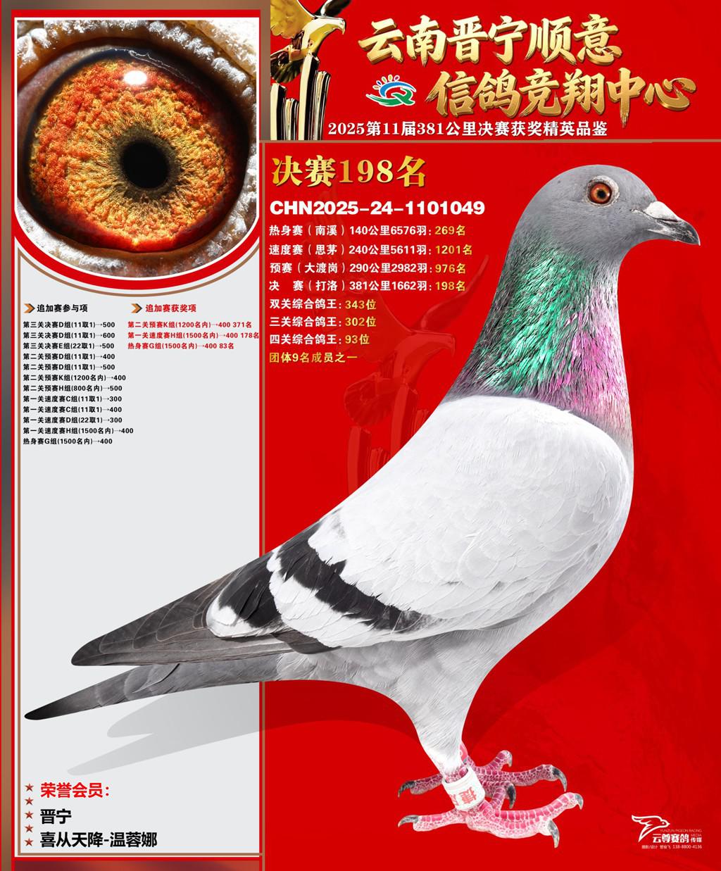 云南晋宁顺意信鸽竞翔中心2025决赛198名喜从天降-温蓉娜2025-24-1101049晋宁获奖鸽展示!