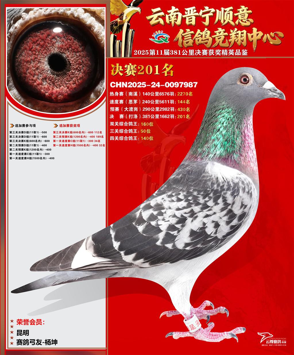 云南晋宁顺意信鸽竞翔中心2025决赛201名赛鸽弓友-杨坤2025-24-0097987昆明获奖鸽展示!