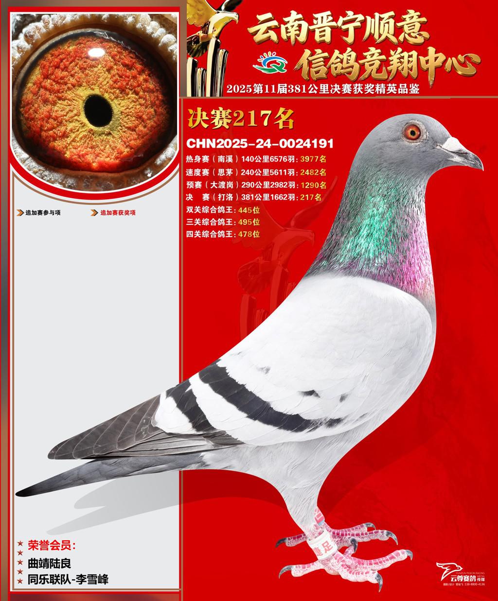 云南晋宁顺意信鸽竞翔中心2025决赛217名同乐联队-李雪峰2025-24-0024191曲靖陆良获奖鸽展示!