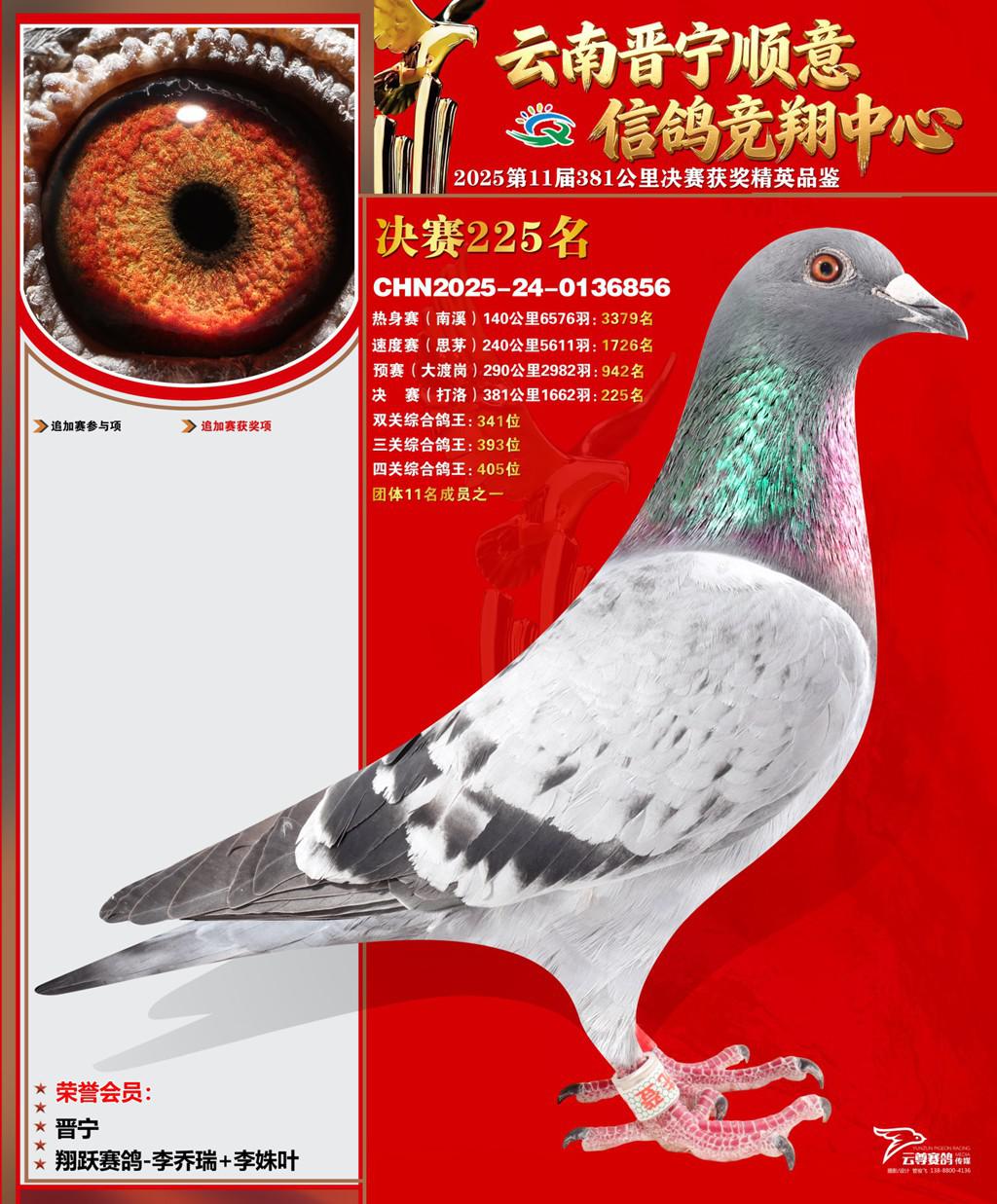 云南晋宁顺意信鸽竞翔中心2025决赛225名翔跃赛鸽-李乔瑞+李姝叶2025-24-0136856晋宁获奖鸽展示!