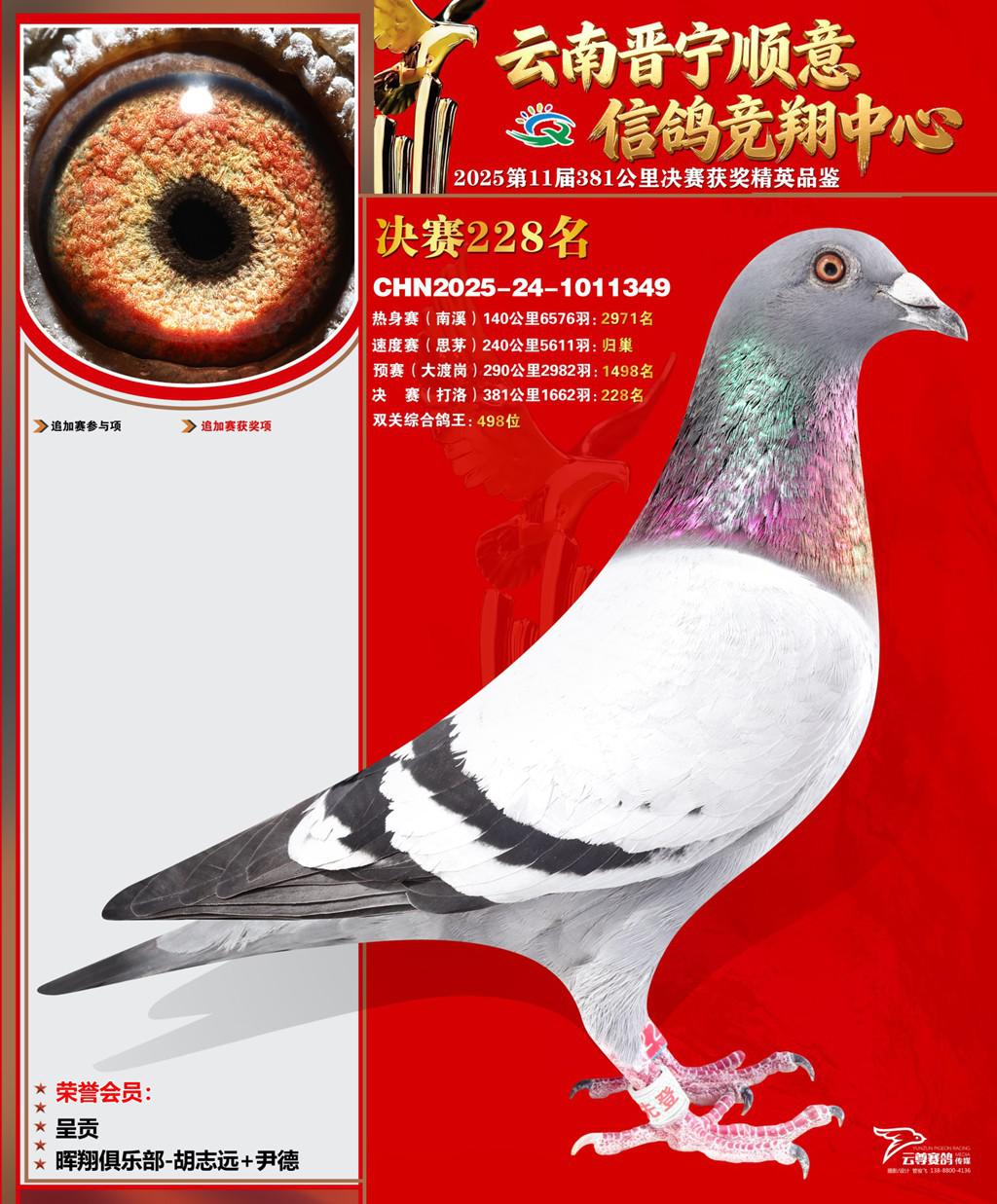 云南晋宁顺意信鸽竞翔中心2025决赛228名晖翔俱乐部-胡志远+尹德2025-24-1011349呈贡获奖鸽展示!