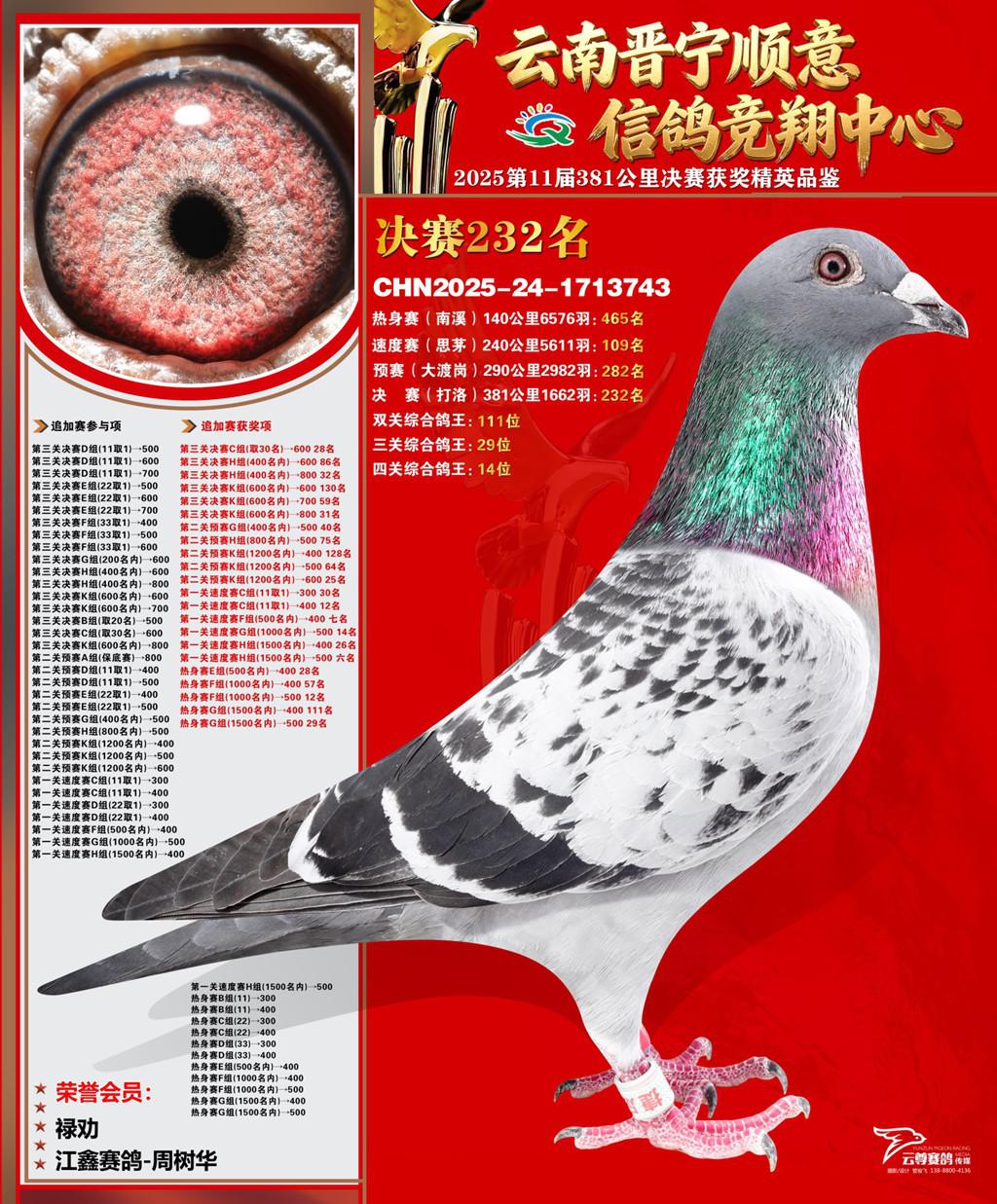 云南晋宁顺意信鸽竞翔中心2025决赛232名江鑫赛鸽-周树华2025-24-1713743禄劝获奖鸽展示!