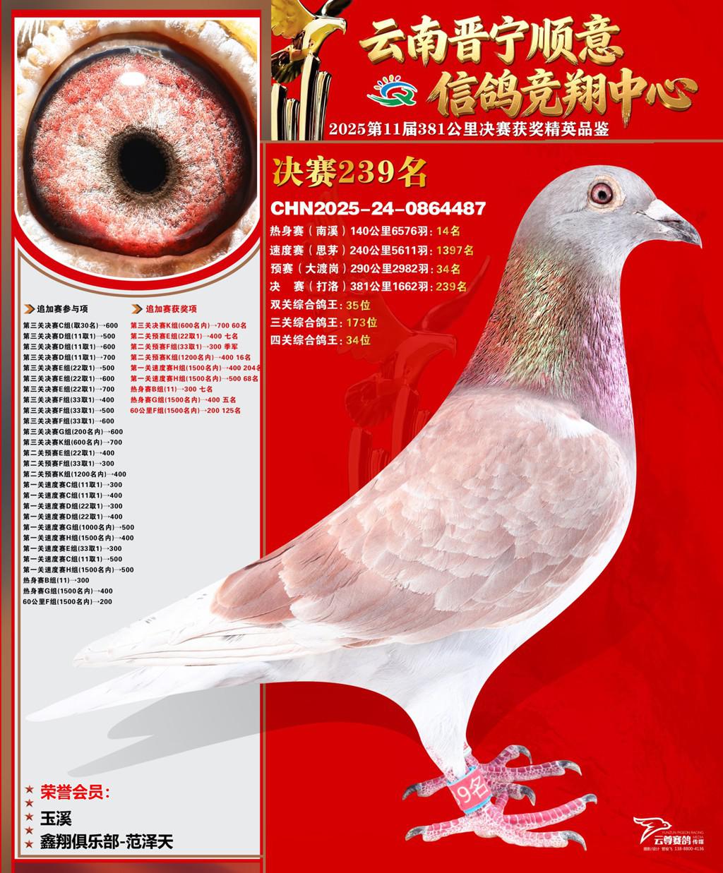 云南晋宁顺意信鸽竞翔中心2025决赛239名鑫翔俱乐部-范泽天2025-24-0864487玉溪获奖鸽展示!