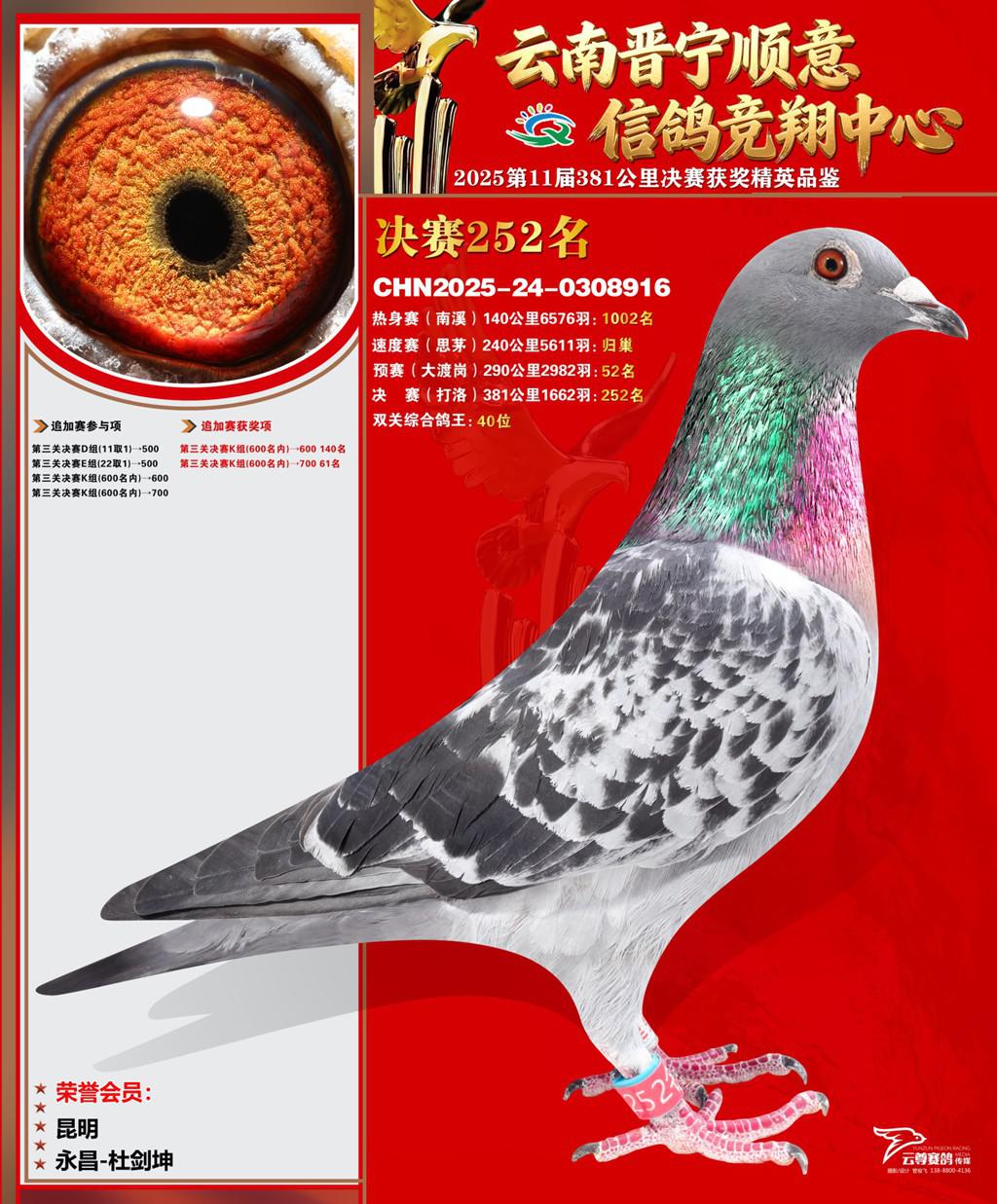 云南晋宁顺意信鸽竞翔中心2025决赛252名永昌-杜剑坤2025-24-0308916昆明获奖鸽展示!
