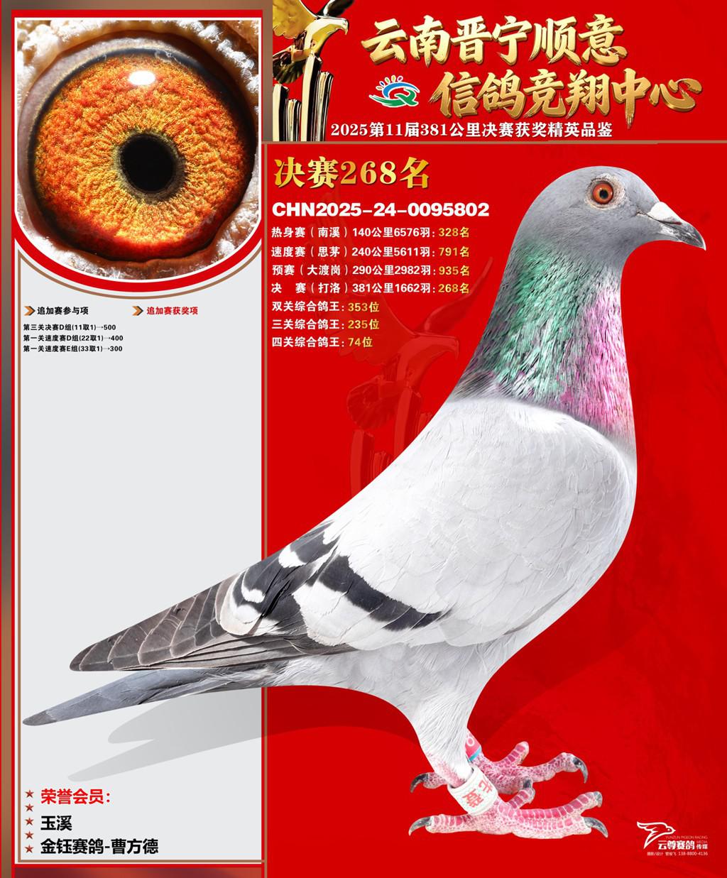 云南晋宁顺意信鸽竞翔中心2025决赛268名金钰赛鸽-曹方德2025-24-0095802玉溪获奖鸽展示!