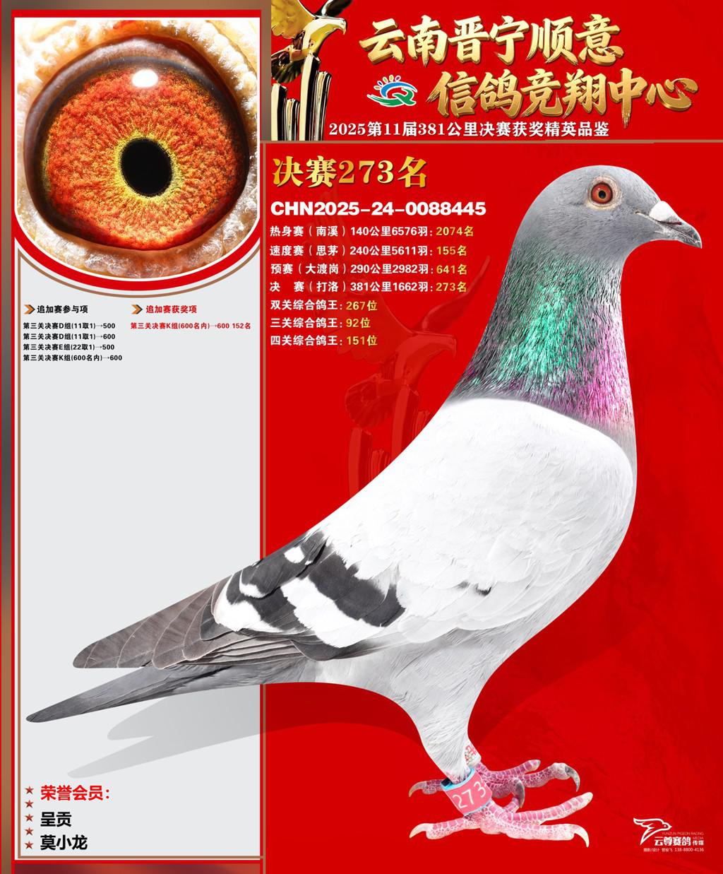 云南晋宁顺意信鸽竞翔中心2025决赛273名莫小龙2025-24-0088445呈贡获奖鸽展示!