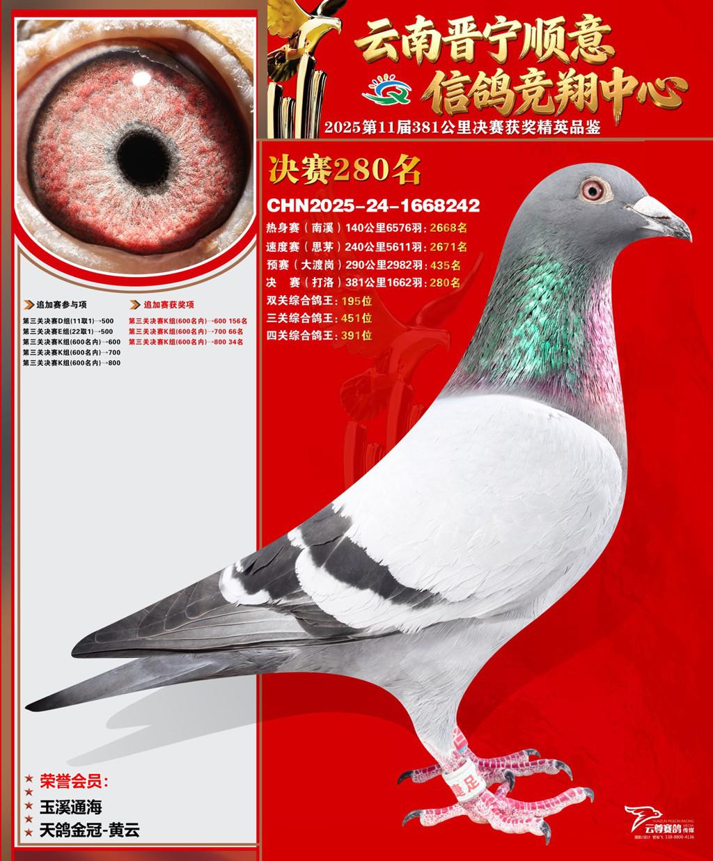 云南晋宁顺意信鸽竞翔中心2025决赛280名天鸽金冠-黄云2025-24-1668242玉溪通海获奖鸽展示!