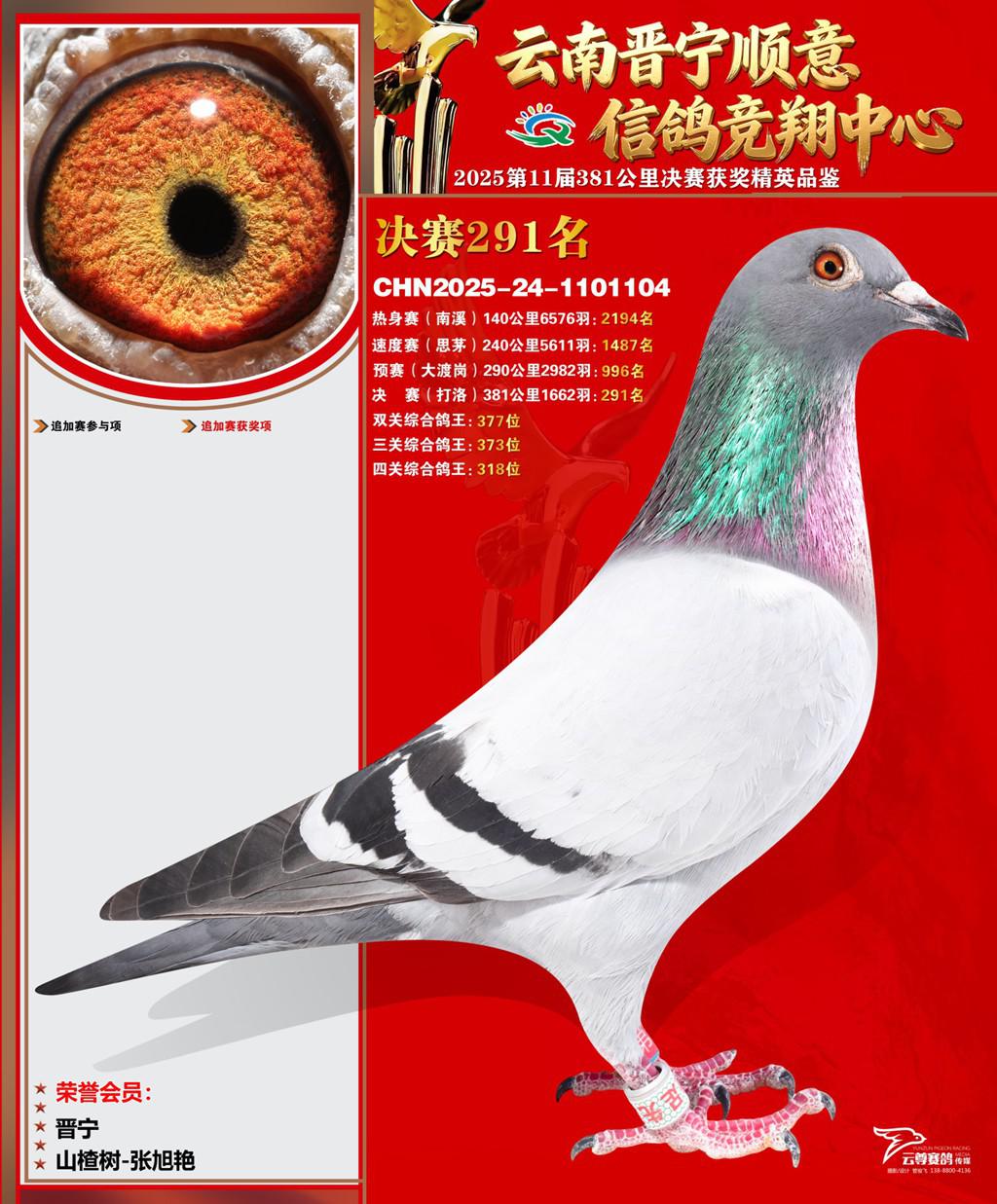 云南晋宁顺意信鸽竞翔中心2025决赛291名山楂树-张旭艳2025-24-1101104晋宁获奖鸽展示!