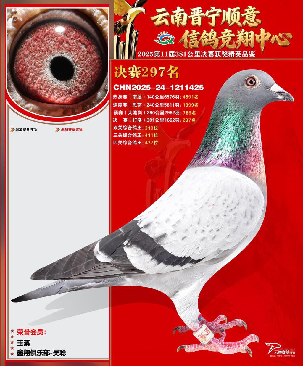 云南晋宁顺意信鸽竞翔中心2025决赛297名鑫翔俱乐部-吴聪2025-24-1211425玉溪获奖鸽展示!