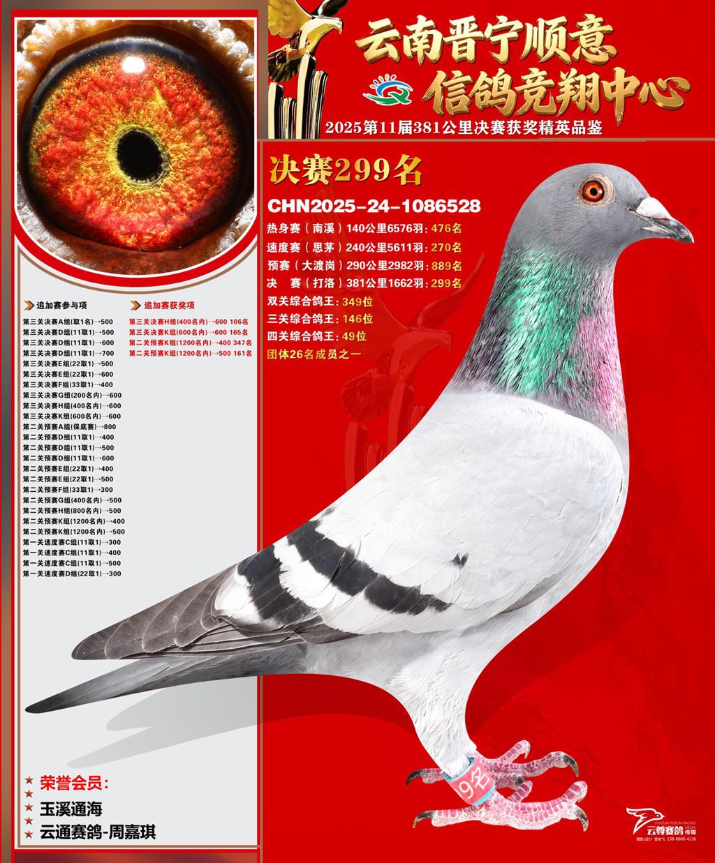 云南晋宁顺意信鸽竞翔中心2025决赛299名云通赛鸽-周嘉琪2025-24-1086528玉溪通海获奖鸽展示!