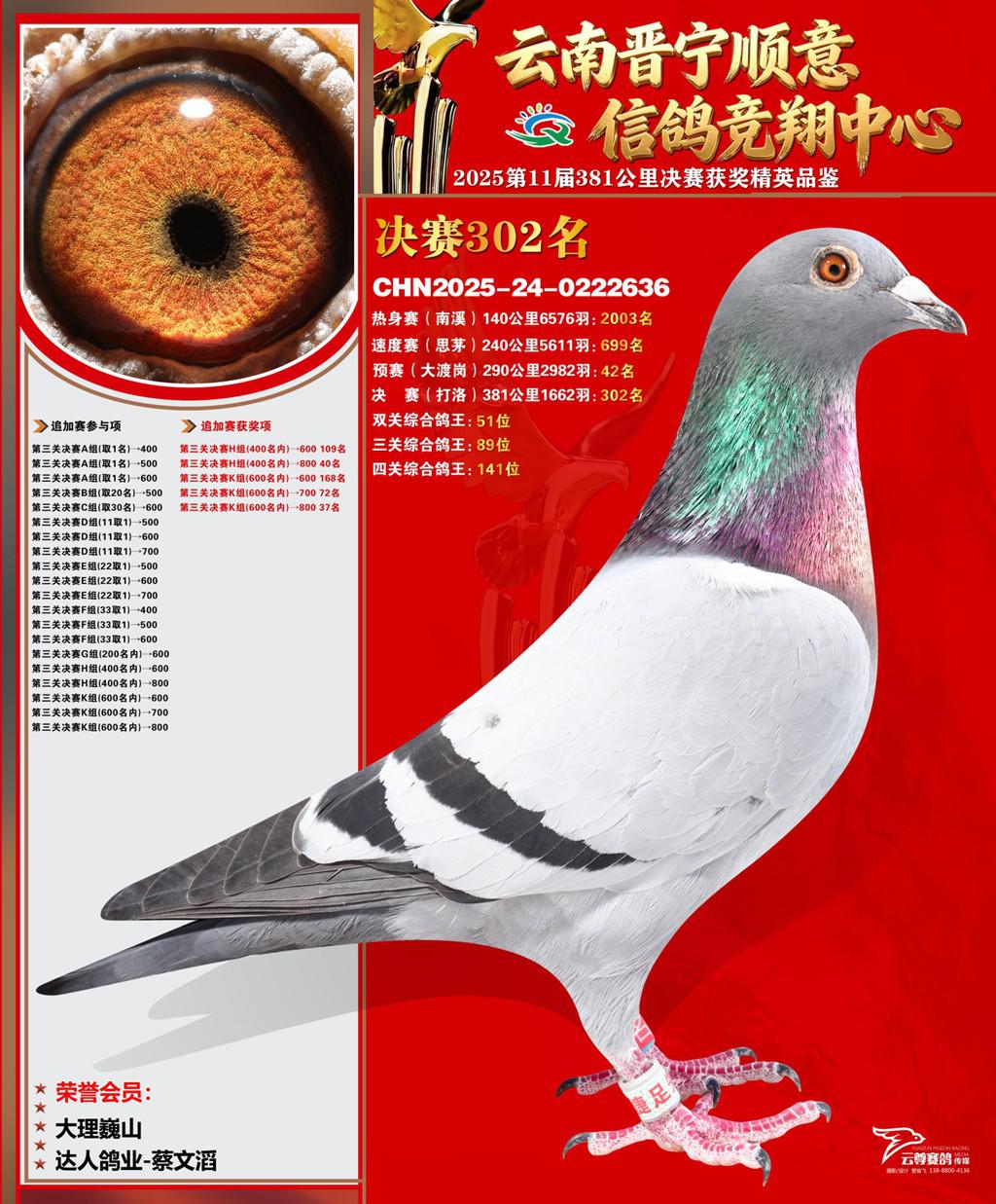 云南晋宁顺意信鸽竞翔中心2025决赛302名达人鸽业-蔡文滔2025-24-0222636大理巍山获奖鸽展示!