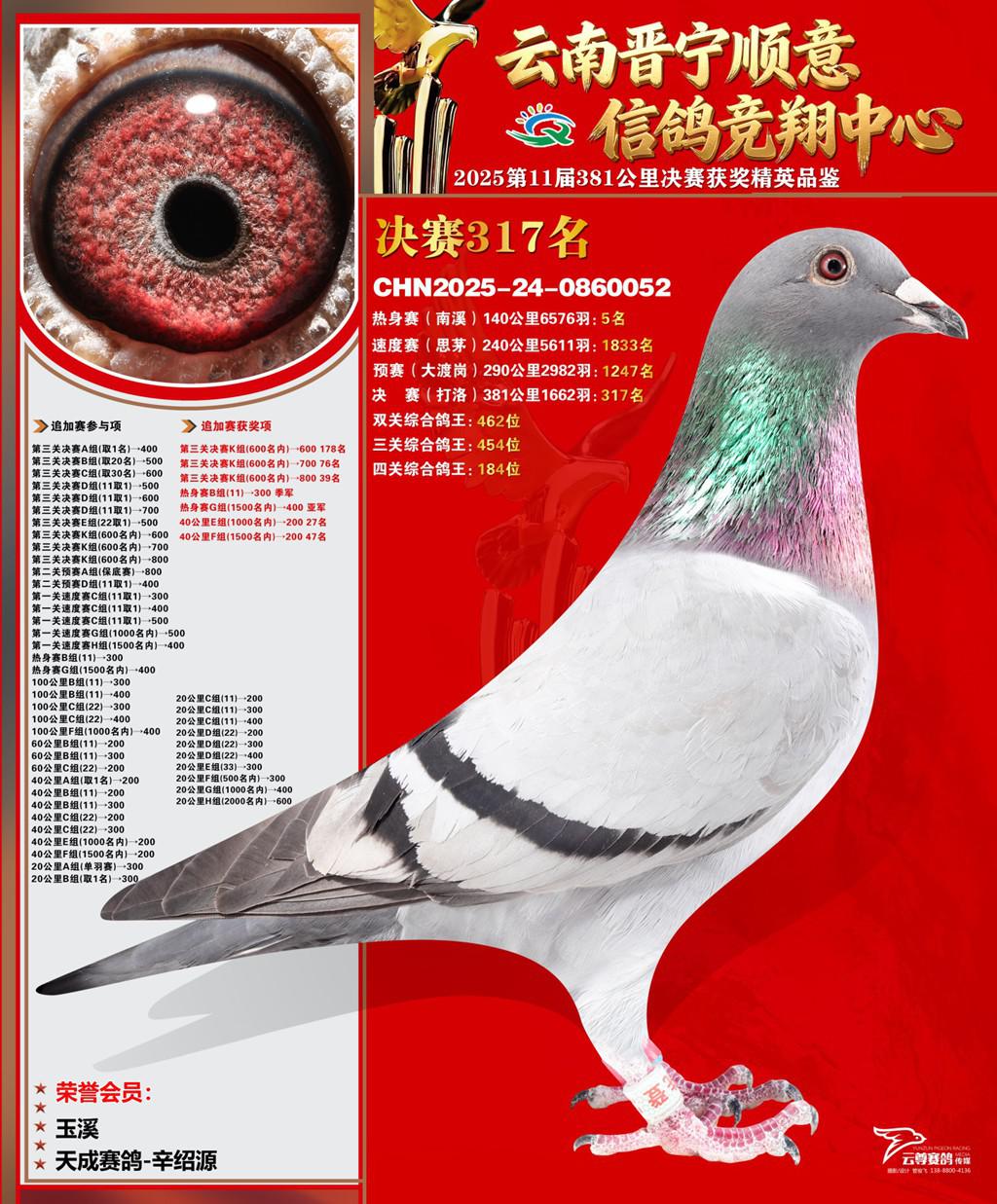 云南晋宁顺意信鸽竞翔中心2025决赛317名天成赛鸽-辛绍源2025-24-0860052玉溪获奖鸽展示!