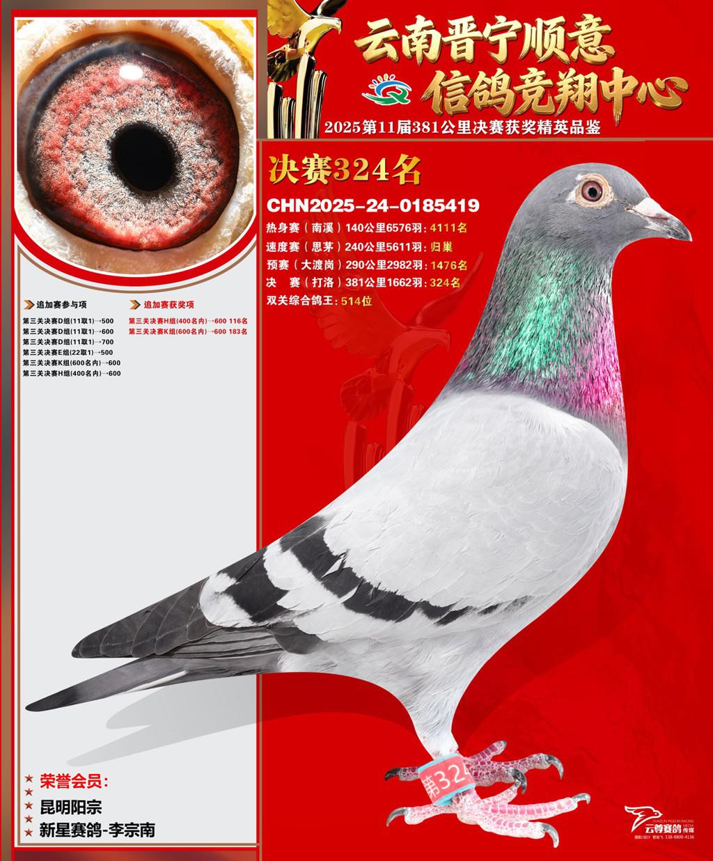 云南晋宁顺意信鸽竞翔中心2025决赛324名新星赛鸽-李宗南2025-24-0185419昆明阳宗获奖鸽展示!