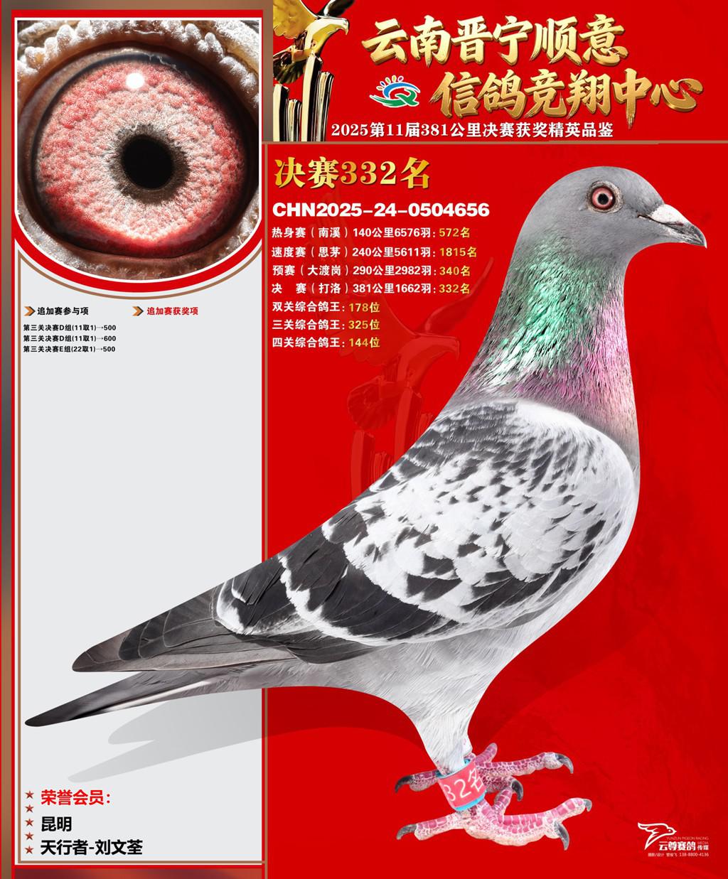 云南晋宁顺意信鸽竞翔中心2025决赛332名天行者-刘文荃2025-24-0504656昆明获奖鸽展示!