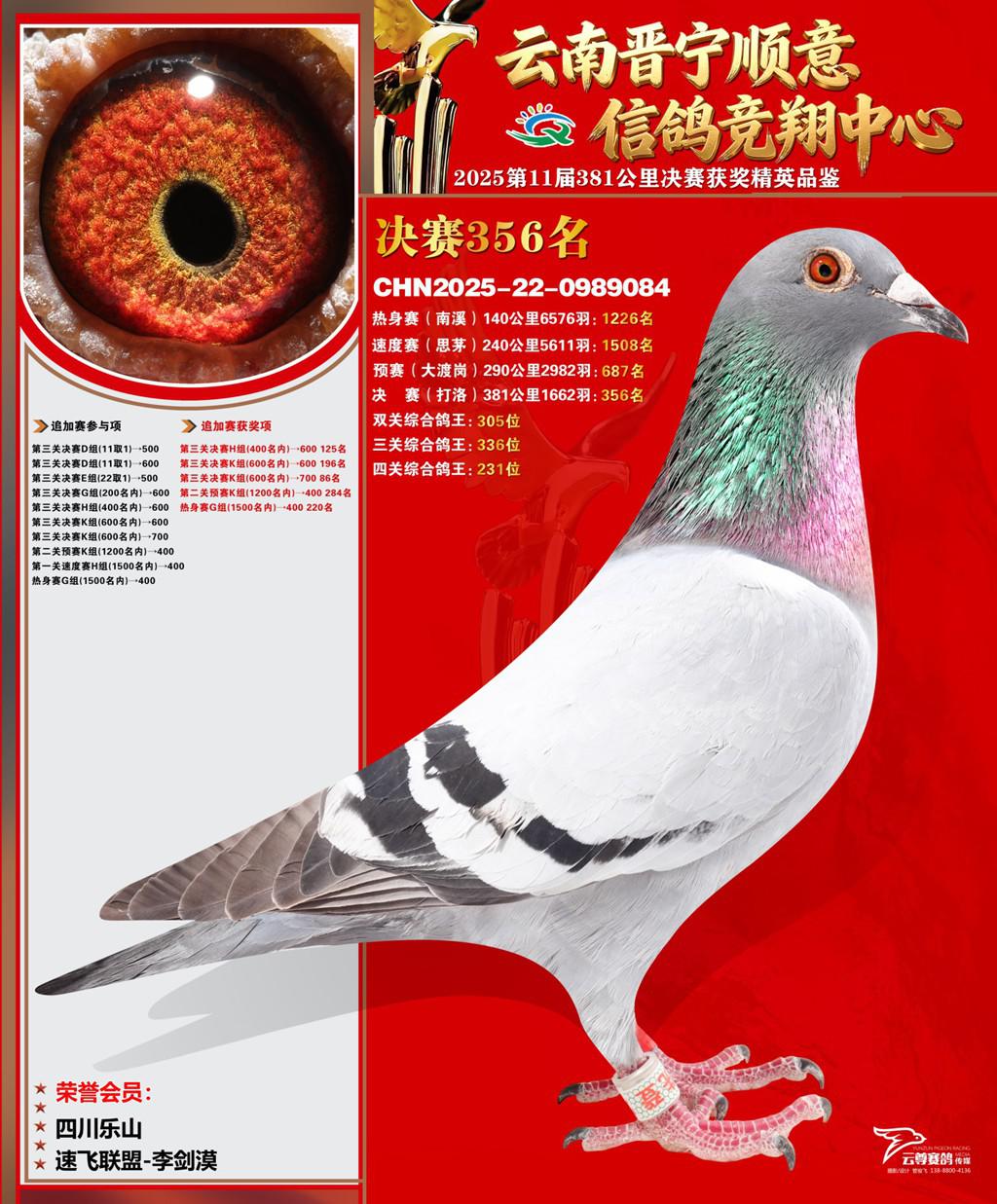 云南晋宁顺意信鸽竞翔中心2025决赛356名速飞联盟-李剑漠2025-22-0989084四川乐山获奖鸽展示!