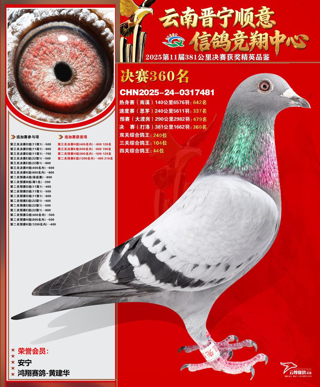 云南晋宁顺意信鸽竞翔中心2025决赛360名鸿翔赛鸽-黄建华2025-24-0317481安宁获奖鸽展示!