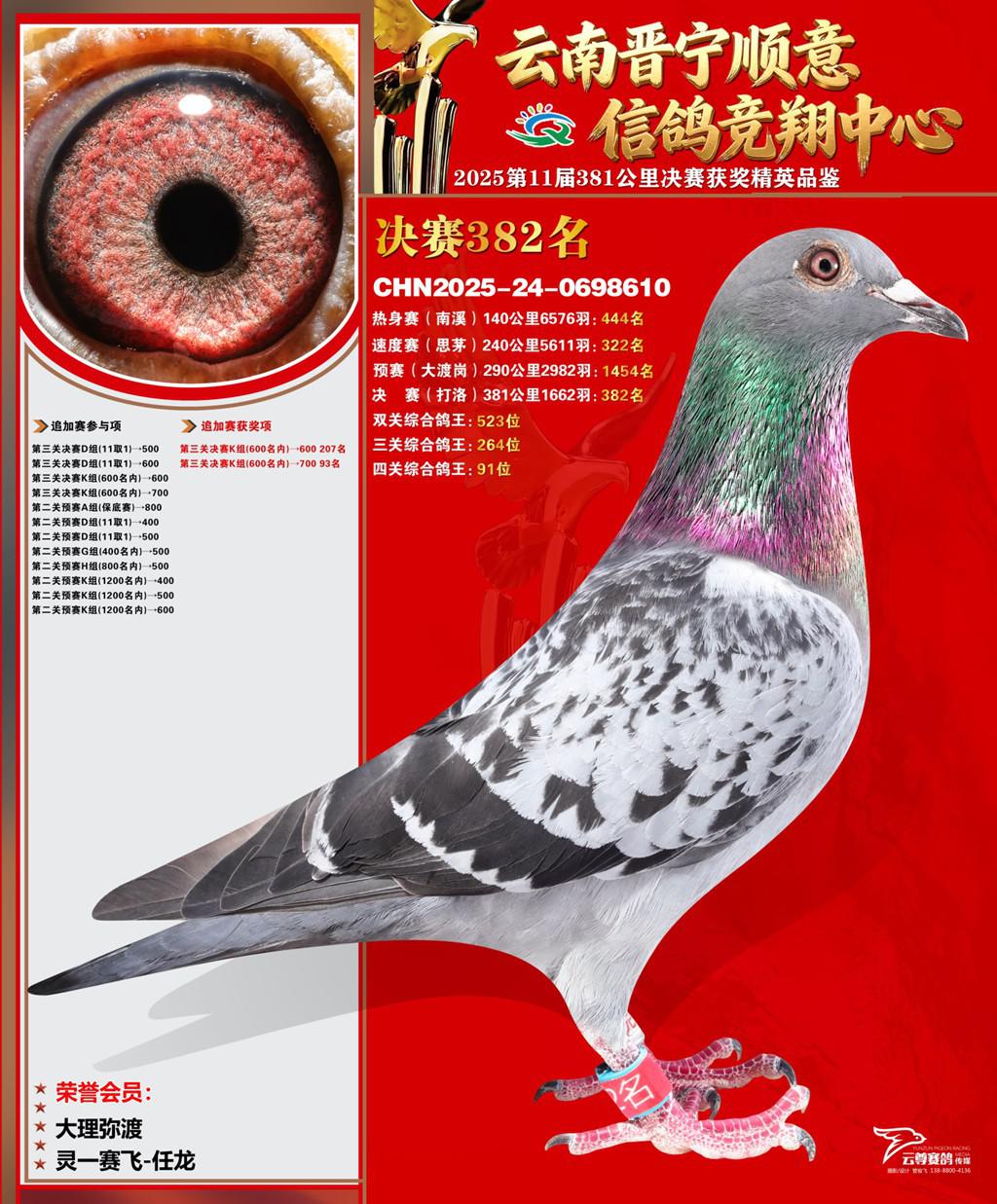 位置:云南晋宁顺意信鸽竞翔中心2025获奖鸽展示\决赛382名