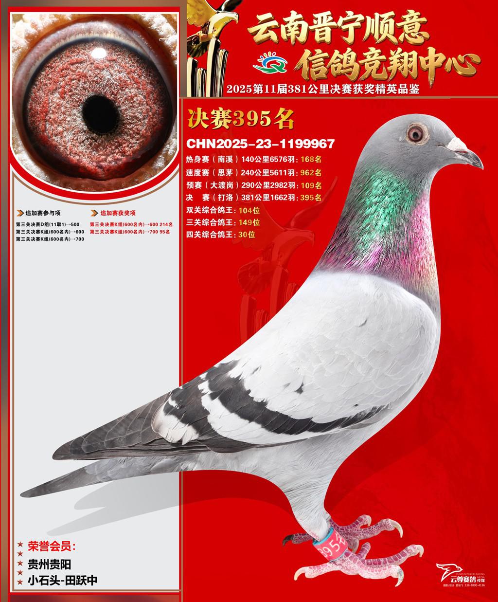 云南晋宁顺意信鸽竞翔中心2025决赛395名小石头-田跃中2025-23-1199967贵州贵阳获奖鸽展示!