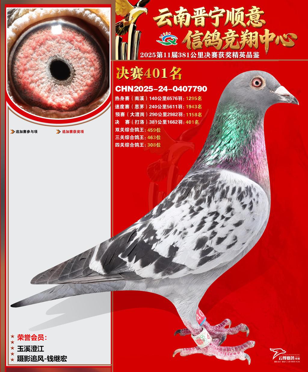 云南晋宁顺意信鸽竞翔中心2025决赛401名蹑影追风-钱继宏2025-24-0407790玉溪澄江获奖鸽展示!