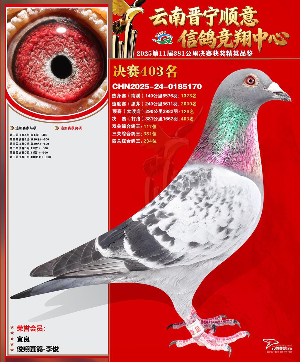 位置:云南晋宁顺意信鸽竞翔中心2025获奖鸽展示\决赛403名