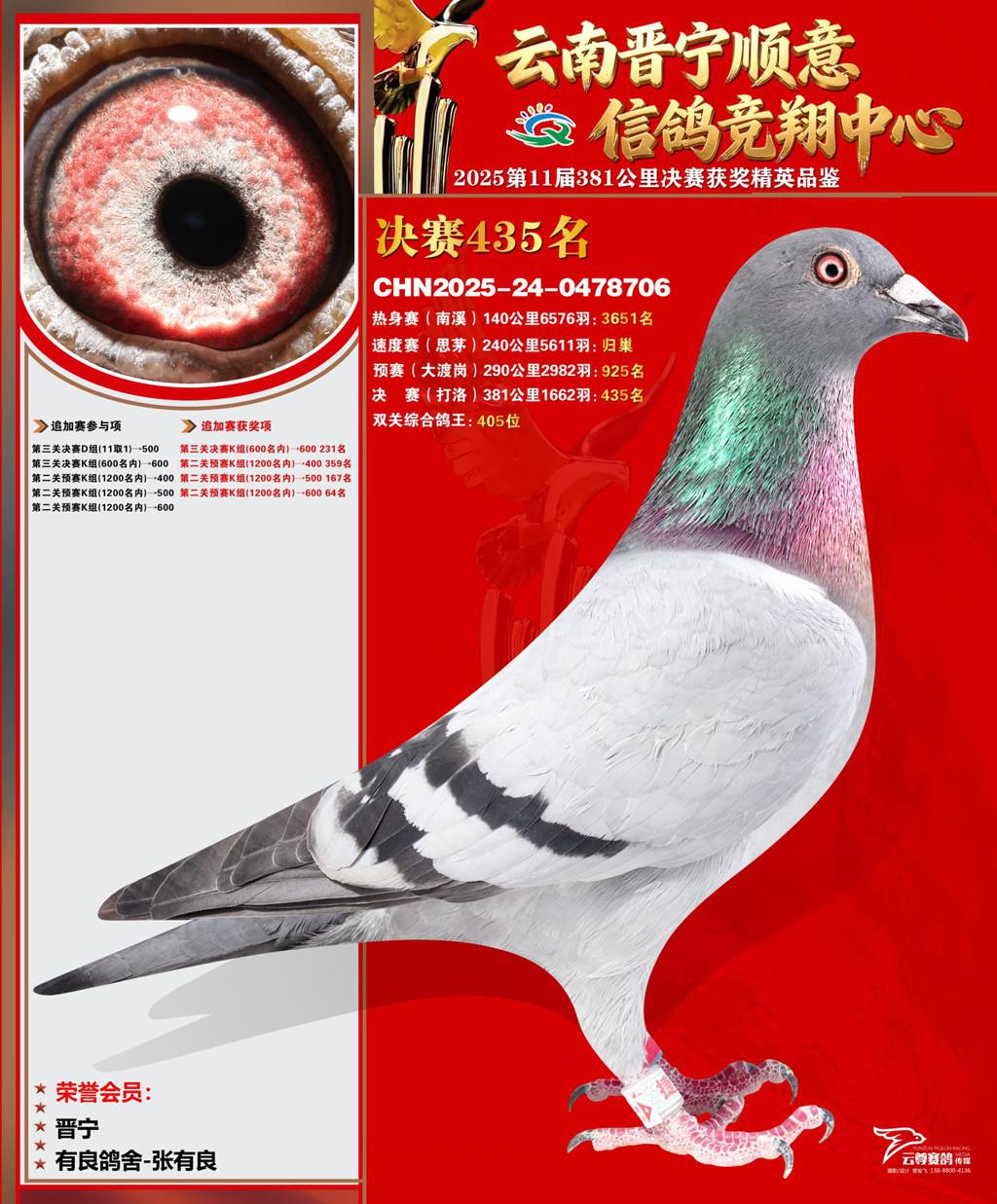 云南晋宁顺意信鸽竞翔中心2025决赛435名有良鸽舍-张有良2025-24-0478706晋宁获奖鸽展示!