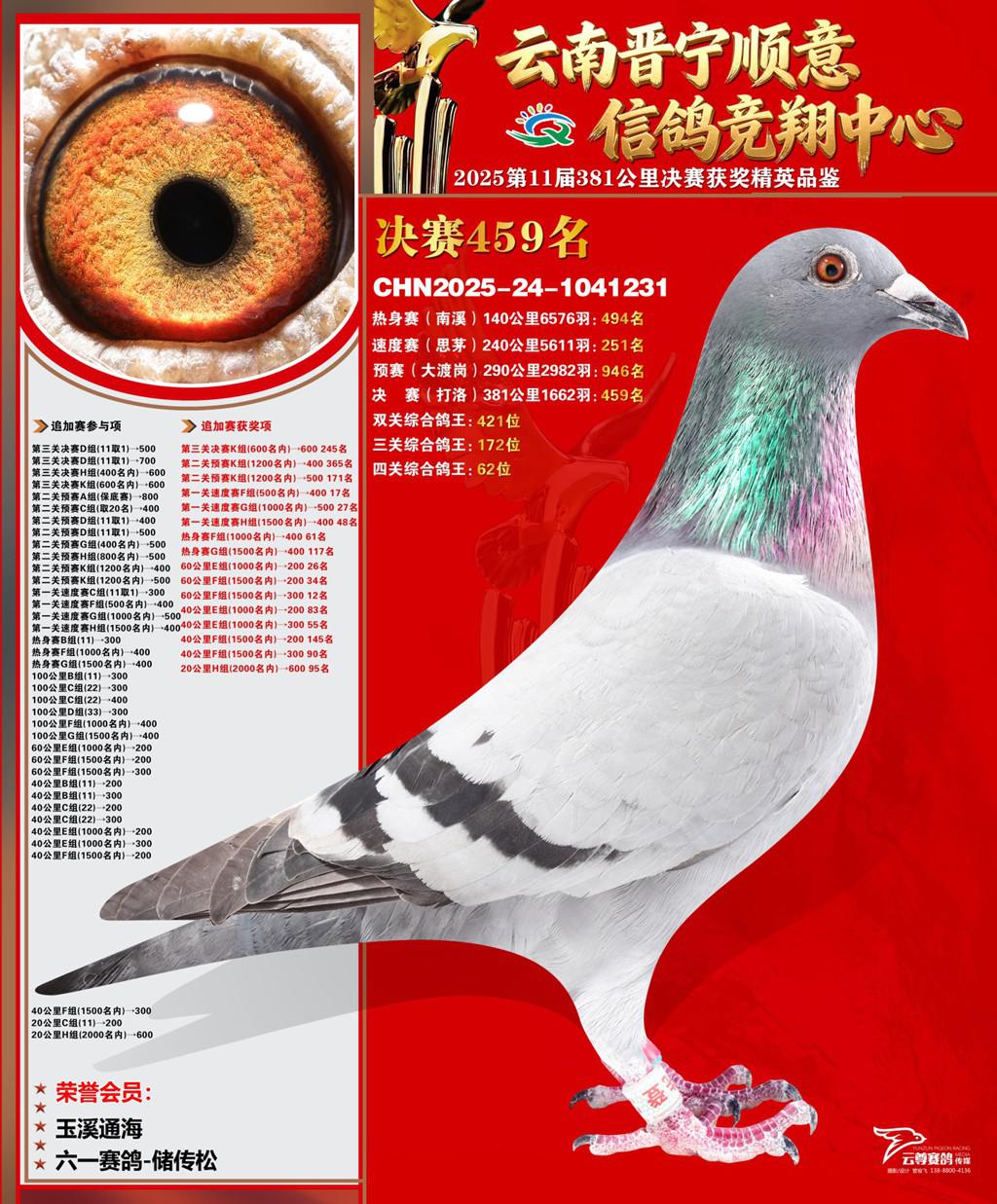 云南晋宁顺意信鸽竞翔中心2025决赛459名六一赛鸽-储传松2025-24-1041231玉溪通海获奖鸽展示!
